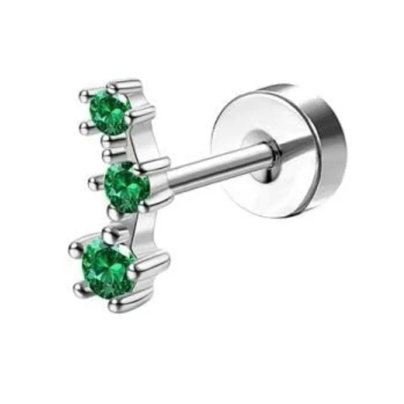 Fijne zilveren piercing met drie groene diamanten die boven elkaar zijn gerangschikt, van chirurgisch roestvrij staal, geschikt voor gevoelige oren. Volledige beschrijving