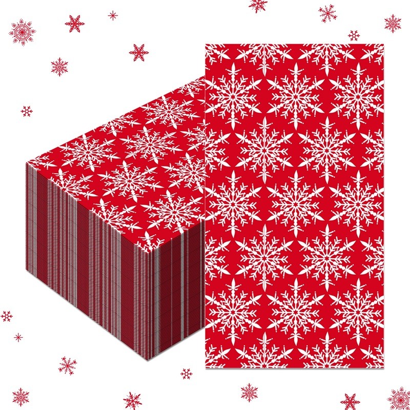 Kerstservetten met het motief van witte sneeuwvlokken op een rode achtergrond creëren een winterse sfeer op de feesttafel en vullen de kerstdecoraties prachtig aan. Volledige beschrijving