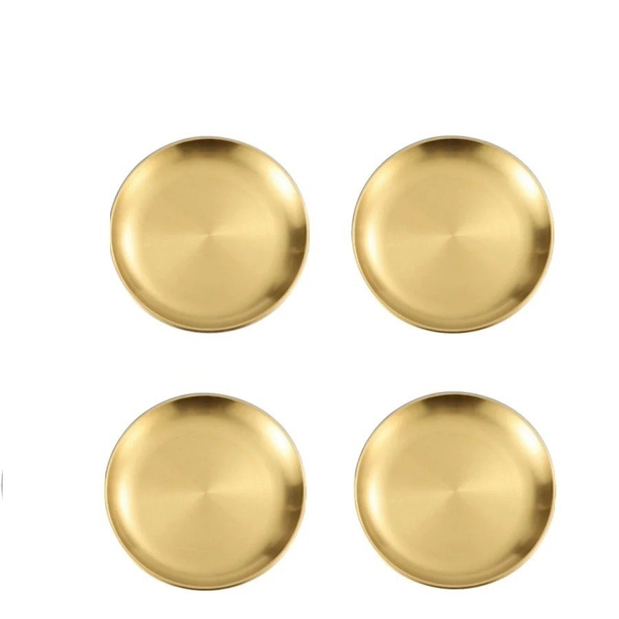 De borden zijn gemaakt van roestvrij staal, wat zorgt voor sterkte, duurzaamheid en een lange levensduur. Het gladde oppervlak maakt onderhoud en snelle reiniging eenvoudig. De gouden afwerking laat zich gemakkelijk combineren met ander servies. De ronde vorm zorgt voor stabiliteit en gemakkelijke opslag.
