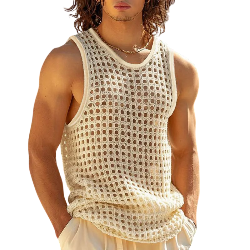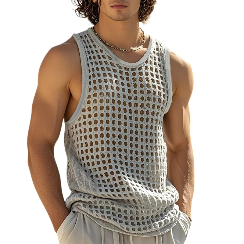 Heren gehaakte tanktop van polyester met geperforeerde structuur biedt hoge ademend vermogen, lichtheid en comfort voor zomer gebruik en sport. Volledige beschrijving