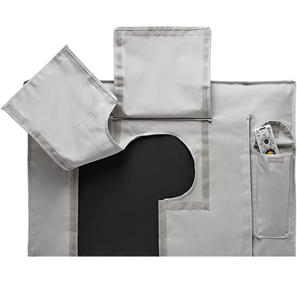 De hoes is ontworpen om universeel te zijn met verschillende soorten houders – het is geschikt voor eenvoudige wandbeugels, uitschuifbare en kantelbare houders met een arm, dubbele wandconstructies en plafondbevestigingen. Het kan ook worden gebruikt voor televisies op een mobiele standaard. Aan de zijkant van de hoes is er een praktische zak voor de afstandsbediening, zodat u deze altijd bij de hand heeft en niet apart hoeft weg te leggen.