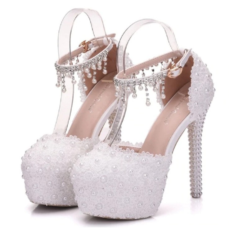 Draag elegante schoenen voor uw bruiloft met deze pumps met kant. De oorbellen zijn versierd met parels.