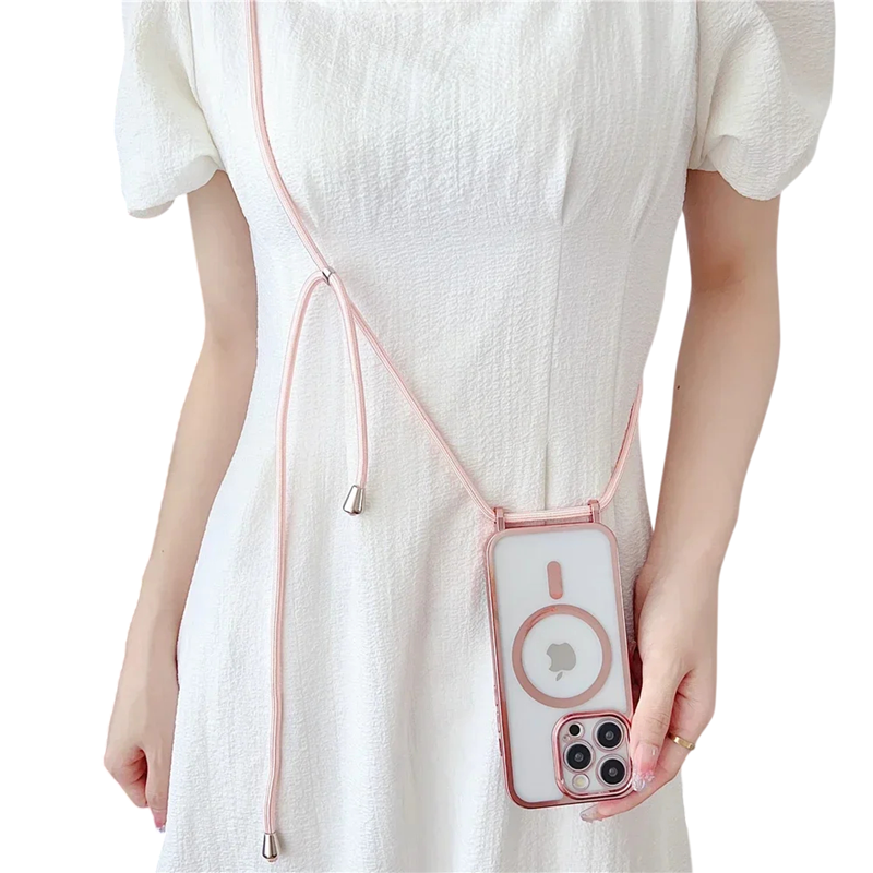 Praktische hoes voor comfortabel dragen van de telefoon met bescherming van de achterkant en randen, magnetische bevestiging en een nekkoord voor elke dag. Volledige beschrijving
