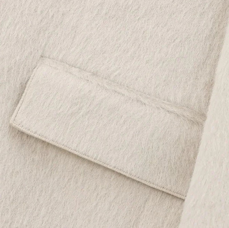 Stijlvolle zachte blazer in beige met kraag en zakken. Ideaal voor de herfst- en winterdagen, perfect voor zowel elegante als casual outfits. Volledige beschrijving