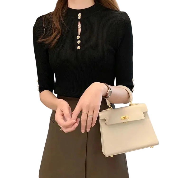 Deze damestrui met halve mouwen vertegenwoordigt de perfecte combinatie van elegantie en comfort. Gemaakt van zachte mix van acryl en katoen, biedt het een aangenaam gevoel tijdens het dragen en behoudt zijn vorm, zelfs na meerdere wasbeurten. Het effen ontwerp met delicate uitsnijding op de borst geeft de outfit een bescheiden, maar toch vrouwelijke uitstraling. De universele maat en lichte materiaal zorgen ervoor dat de trui zich perfect aanpast aan de lichaamsvorm en geschikt is voor zowel werk als vrijetijdsactiviteiten.