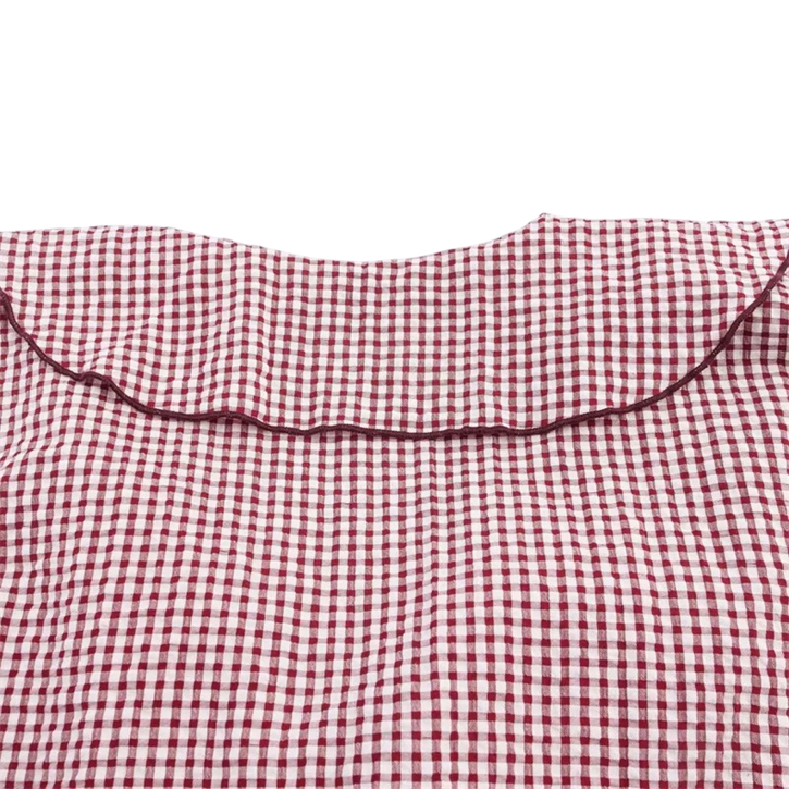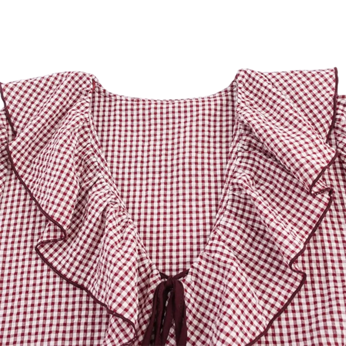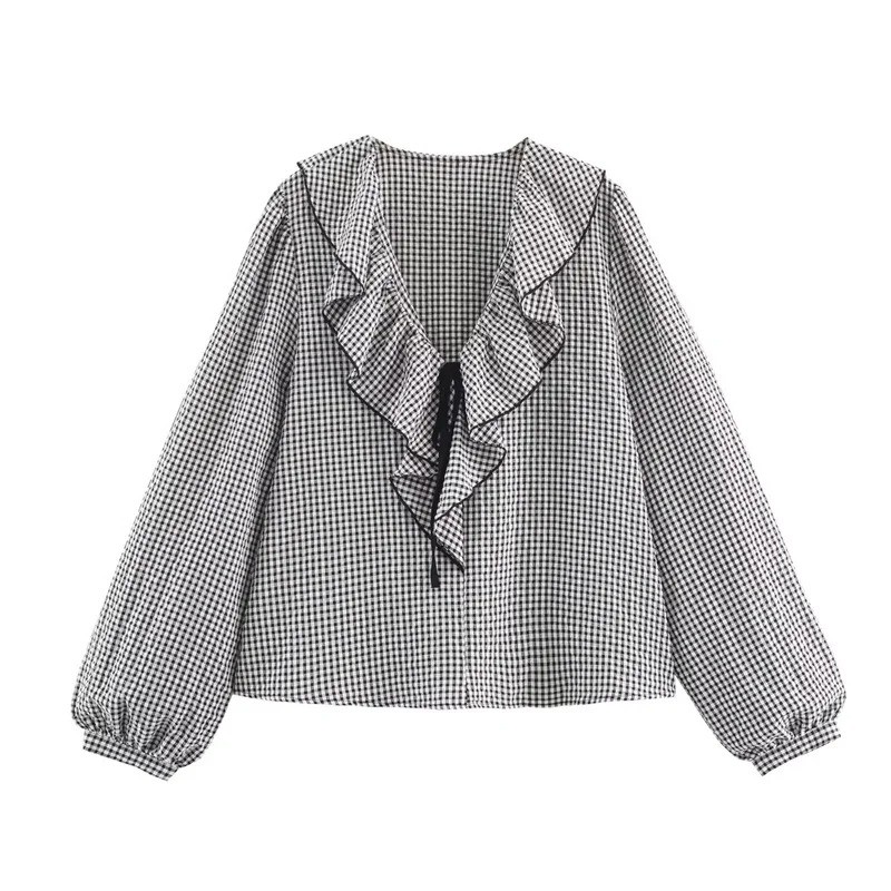 Startpagina Startpagina Kleding en accessoires Dameskleding Dames overhemden Dames geruite overhemden Dames geruite blouse met lange mouwen en volantsneklijn Elegante lichte blouse van polyester voor dagelijks gebruik