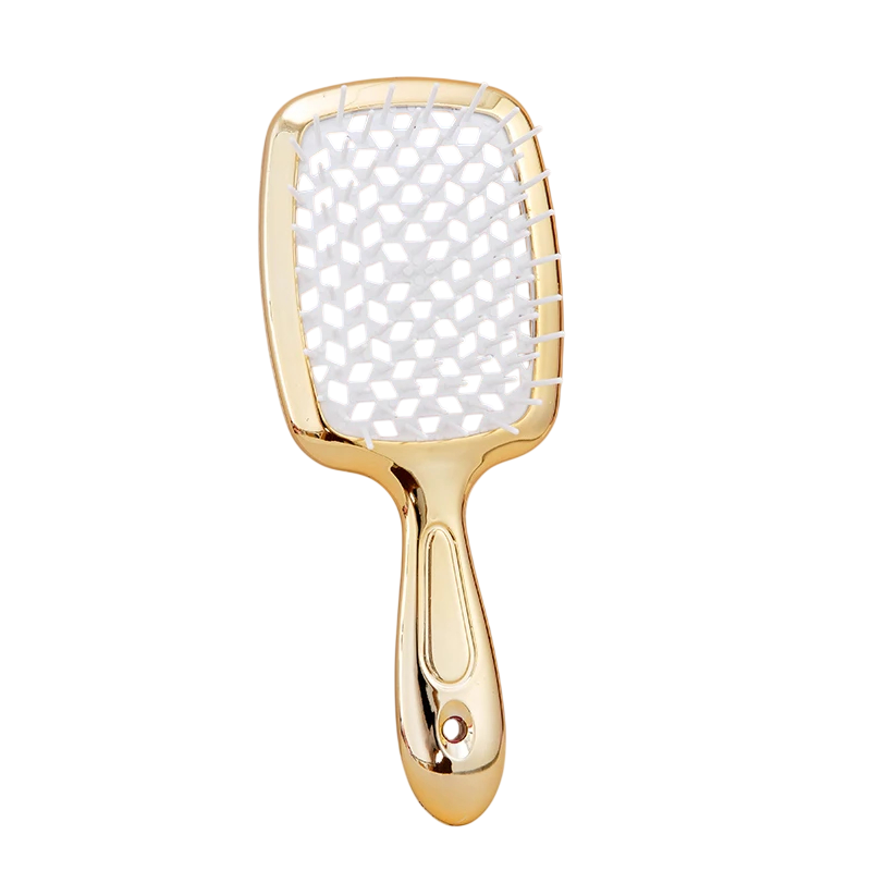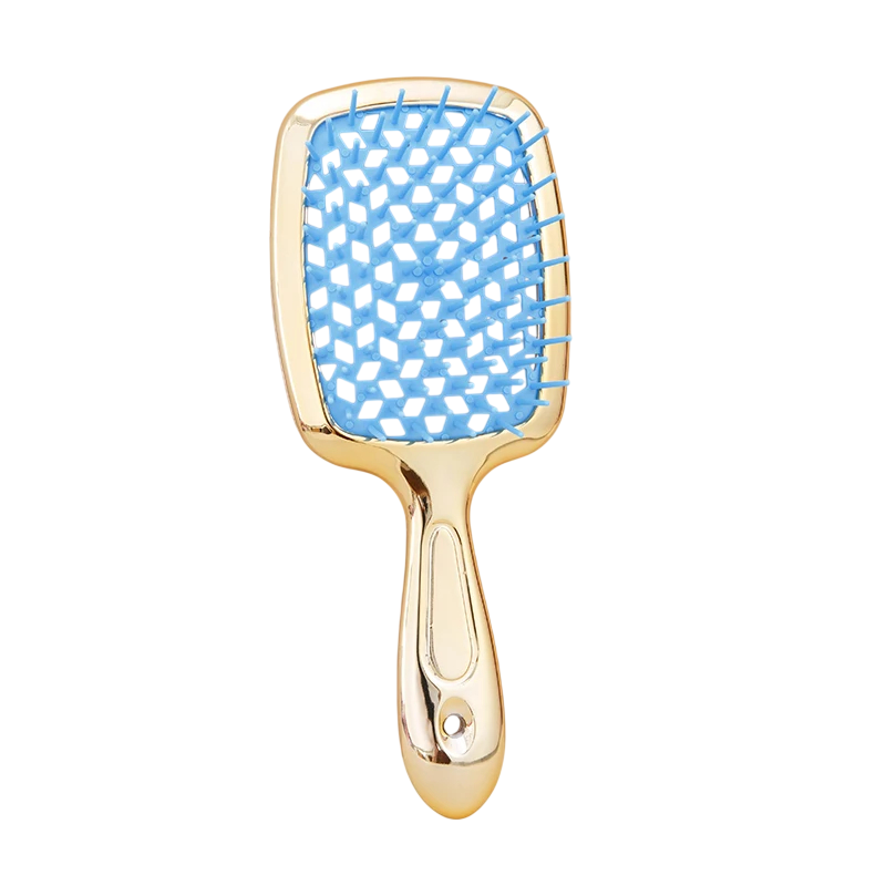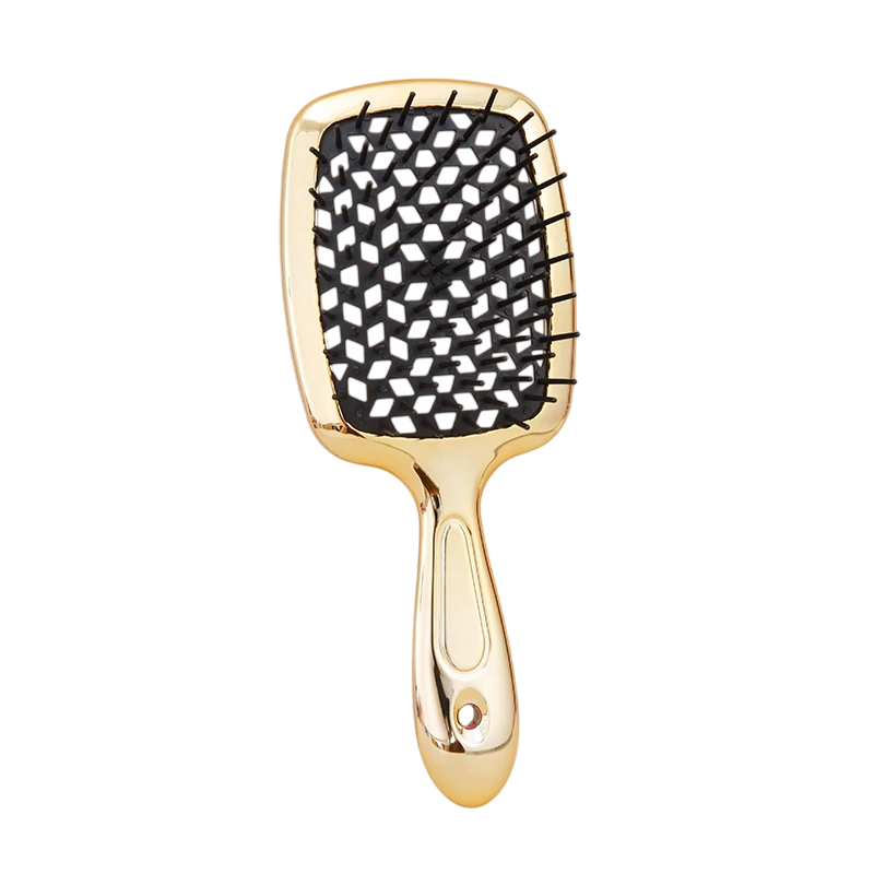 Elegante en praktische haarborstel is de ideale hulp voor dagelijkse haarverzorging. Dankzij de speciale luchtbasis past de borstel zich aan de vorm van het hoofd aan en zorgt voor maximaal comfort tijdens het borstelen. Fijne punten ontklitten voorzichtig zelfs verwarde lokken zonder onnodig trekken en breken van het haar. De borstel is geschikt voor thuisgebruik en professionele kapperssalons. Het moderne gouden ontwerp geeft bovendien een luxe uitstraling aan de styling.