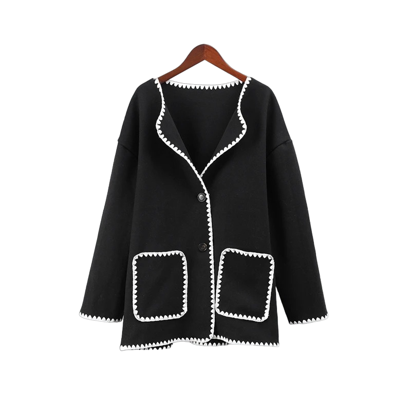 • Conclusie: Een lentejas voor dames met knopen en zwarte biezen is een investering voor de lange termijn. Door de veelzijdigheid van dit item kunt u het in verschillende situaties dragen en het zal u in veel lente-seizoenen goed van pas komen.