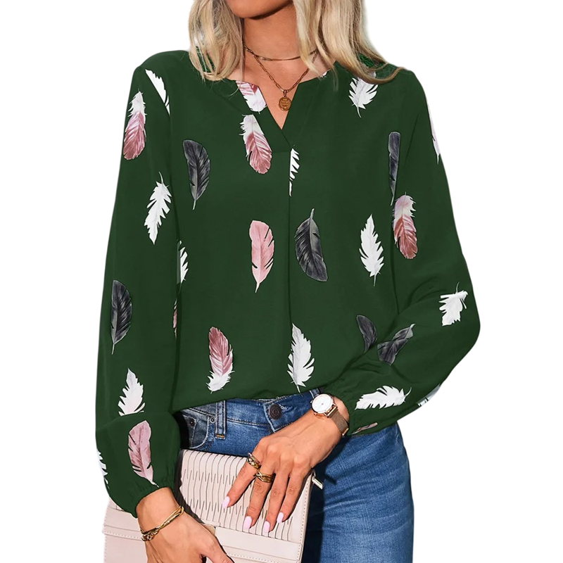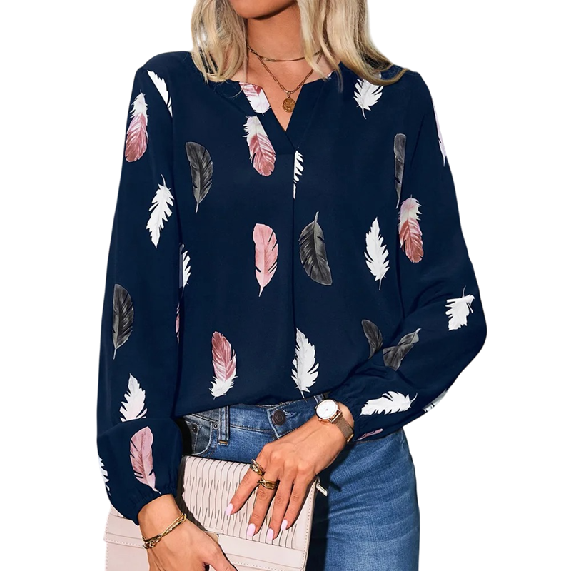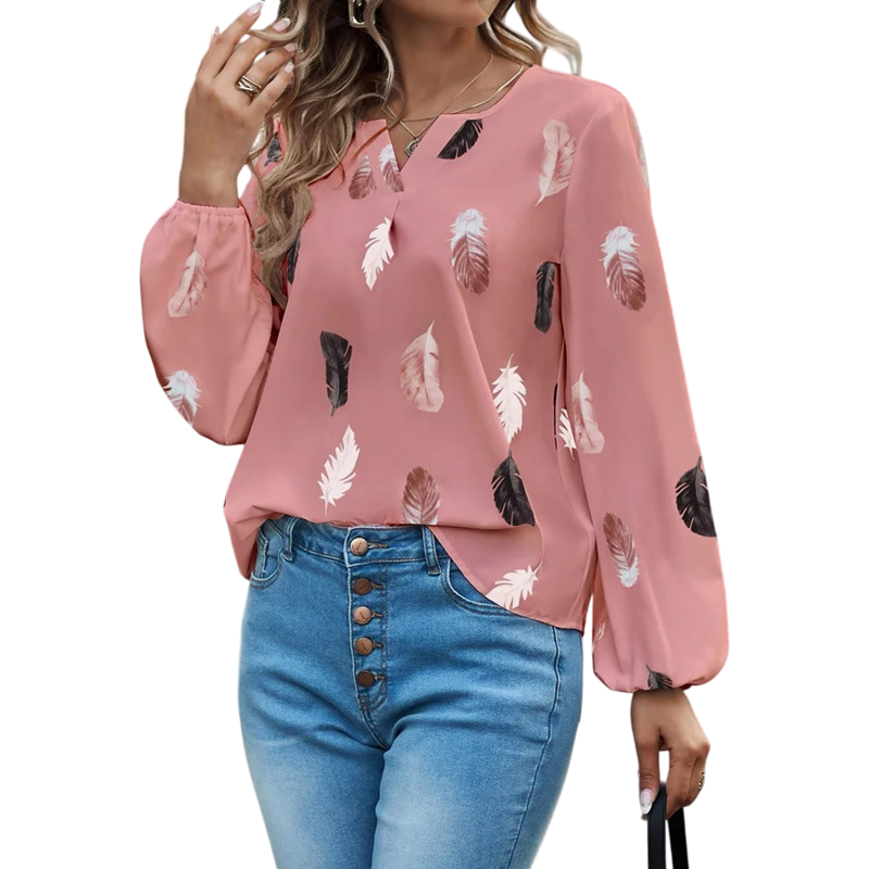 Dames losse blouse lange mouw Lichte blouse met veermotief Elegante luchtige snit Comfortabele polyester Modieuze top voor dagelijks gebruik