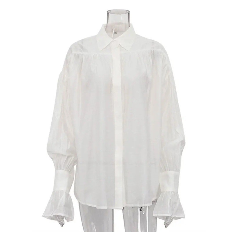 Startpagina Startpagina Kleding en accessoires Dameskleding Dames blouses Dames blouses met lange mouw Dames losse doorschijnende blouse met kraag Lange mouwen Volantmouwen Licht luchtig materiaal Elegante stijl voor zomer en vrije tijd