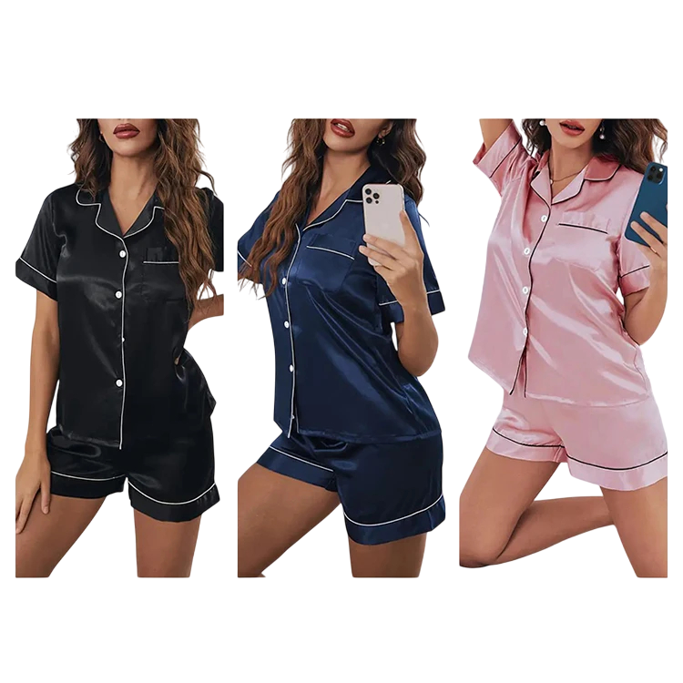 Stijlvolle dames pyjama van zachte satijn met korte mouwen en shorts, aangenaam om aan te raken, ademend en ideaal voor comfortabel slapen en thuis ontspannen. Volledige beschrijving