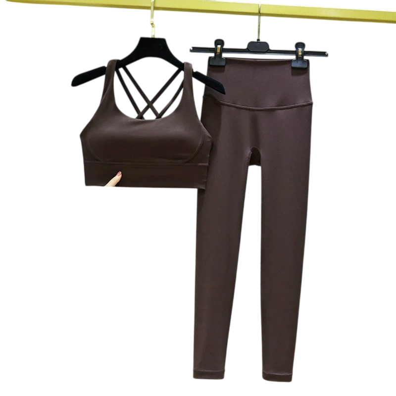 Dames set met leggings en sportbeha, effen, gemaakt van spandex en nylon. Ideaal voor sportieve activiteiten en comfortabel dragen. Volledige beschrijving