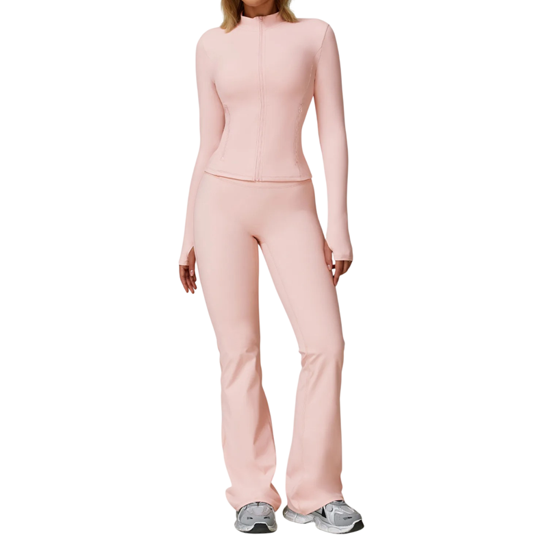 Dames sportset met rits hoodie en broek van nylon en spandex. Eenvoudig ontwerp, ideaal voor fitness, training of vrije tijd, comfortabele en flexibele stof. Volledige beschrijving