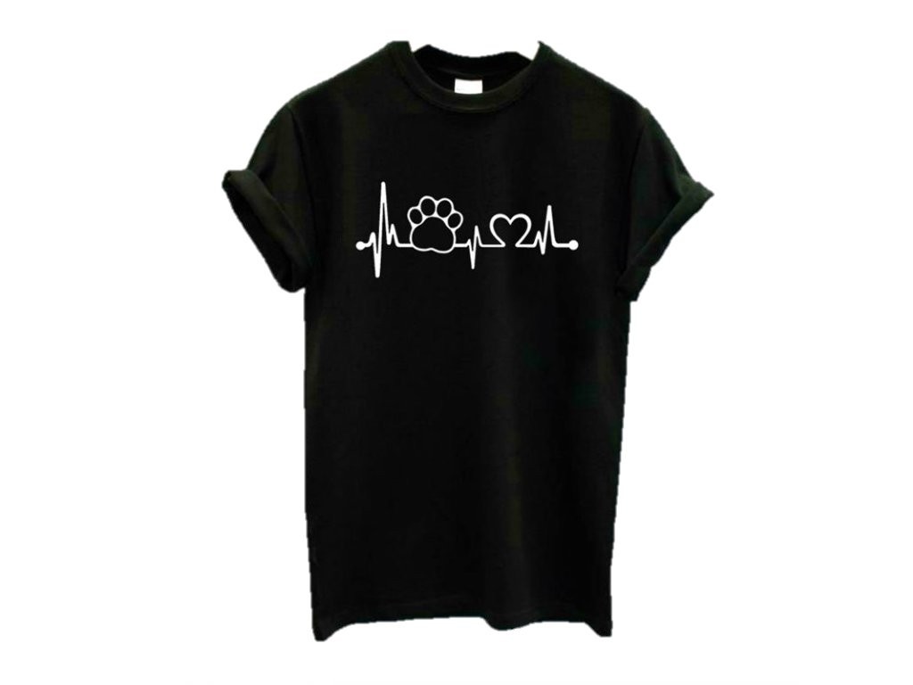 Prachtig dames T-shirt met een hartslagprint met een hart en een hondenpoot voor hondenliefhebbers.