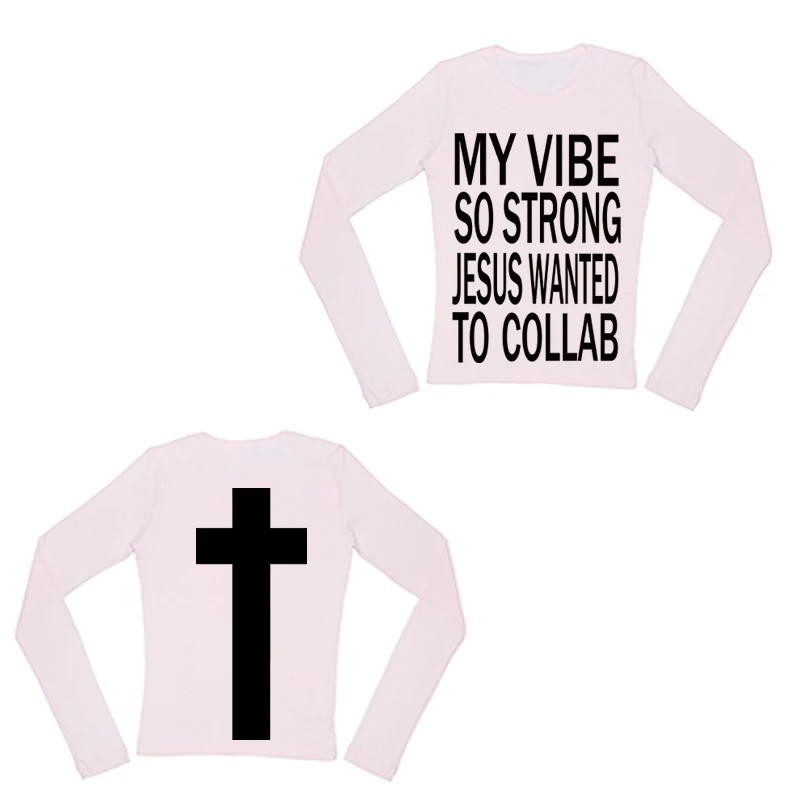 Startpagina Startpagina Kleding en accessoires Dameskleding Dames T-shirts en tops Dames T-shirts en tops met lange mouwen Dames T-shirt met lange mouwen Ronde hals Streetwear met christelijk motief Kruis op de rug en print op de voorkant Originele stijl