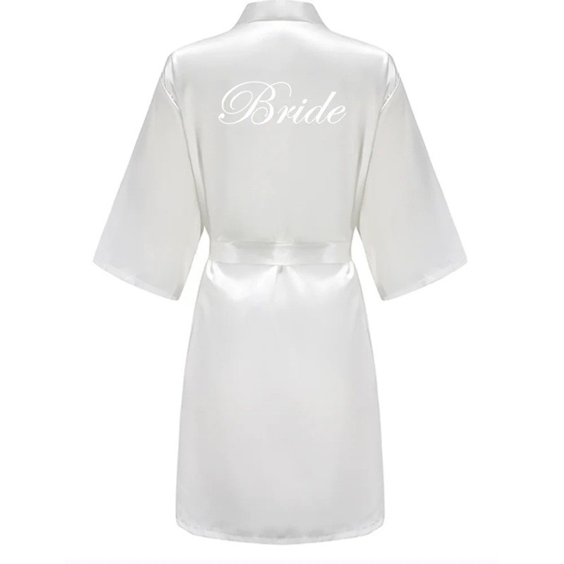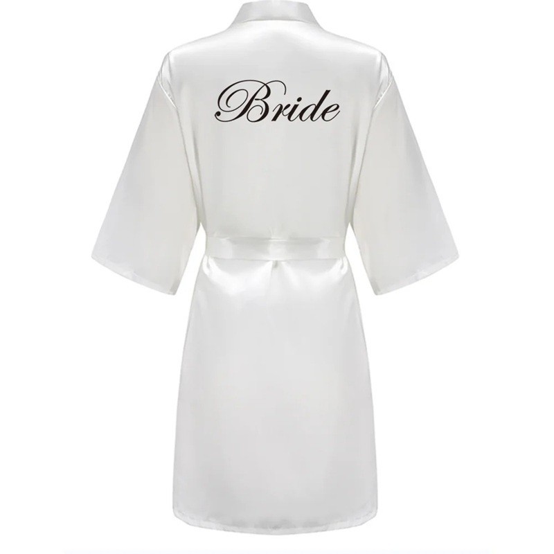 Lichte dames trouwjurk van kunstzijde met de tekst BRIDE en een strik in de taille. Elegante en comfortabele accessoire voor de bruid tijdens de voorbereidingen en fotoshoot. Volledige beschrijving