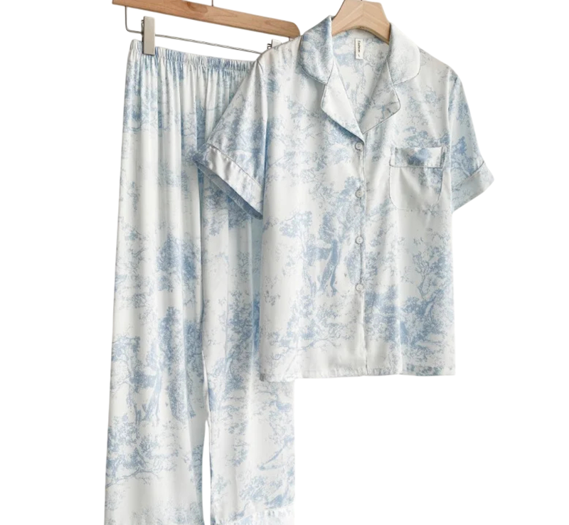 Damespyjama met fijne patronen Hemd met kraag en korte mouwen met knopen en zakje op de borst en broek van zachte polyester en rayon