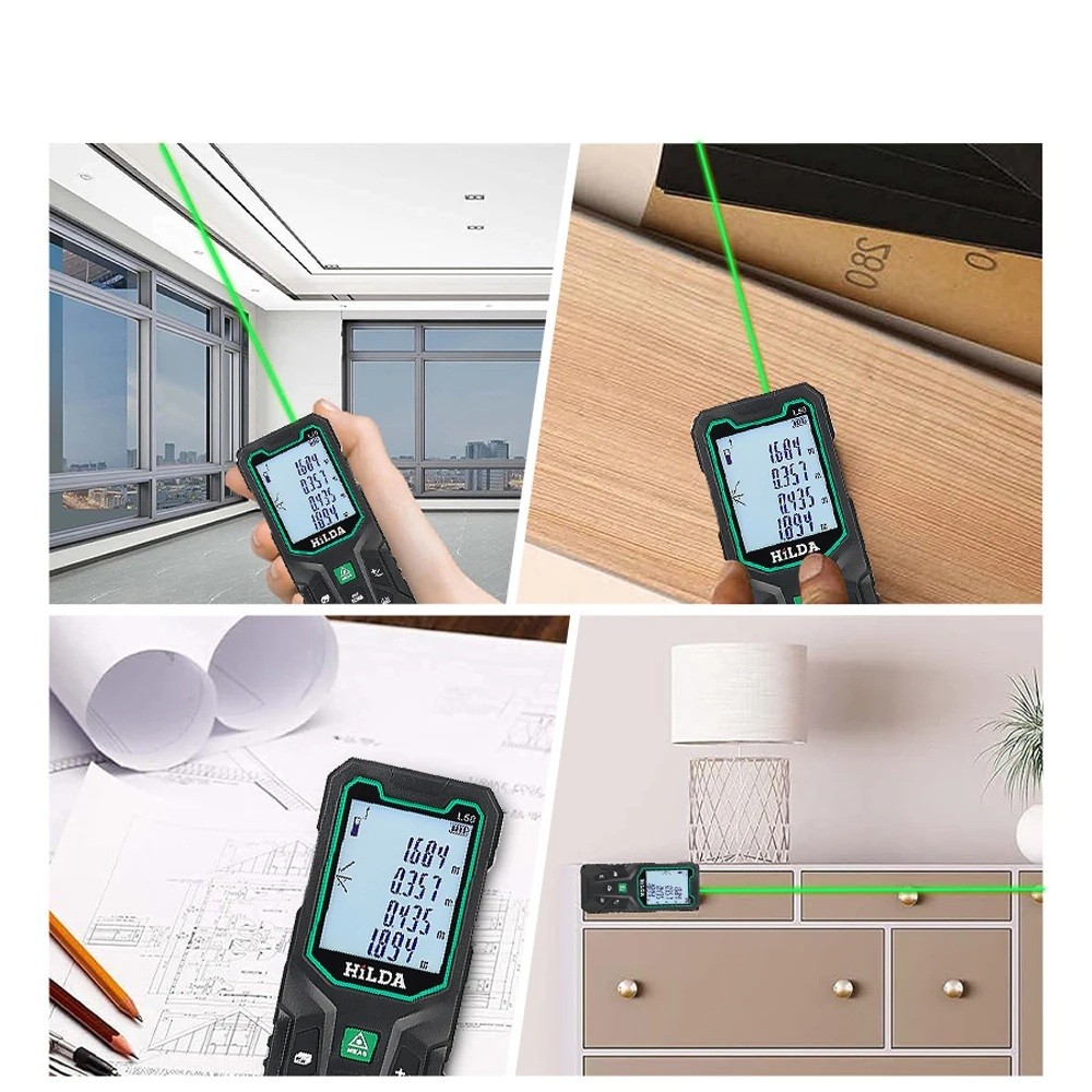 Professionele laserafstandsmeter HILDA 50 m met oppervlakte- en volumemeting, berekeningen met behulp van de stelling van Pythagoras en een verlicht display. Volledige beschrijving