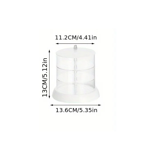 De draaibare organizer is bedoeld voor overzichtelijke opslag van kleine accessoires op een bureau of toilettafel. De constructie bevat 3 opberglagen, die het mogelijk maken om elastiekjes, clips, ringen of andere kleine voorwerpen te scheiden. De organizer is gemaakt van doorzichtig plastic materiaal, zodat de opgeslagen spullen goed zichtbaar zijn. Dankzij de draaibare constructie kunnen de verschillende delen eenvoudig gedraaid worden en is het snel mogelijk om bij de opgeslagen voorwerpen te komen. De compacte afmetingen maken het mogelijk om deze op een bureau of cosmetische tafel te plaatsen.
