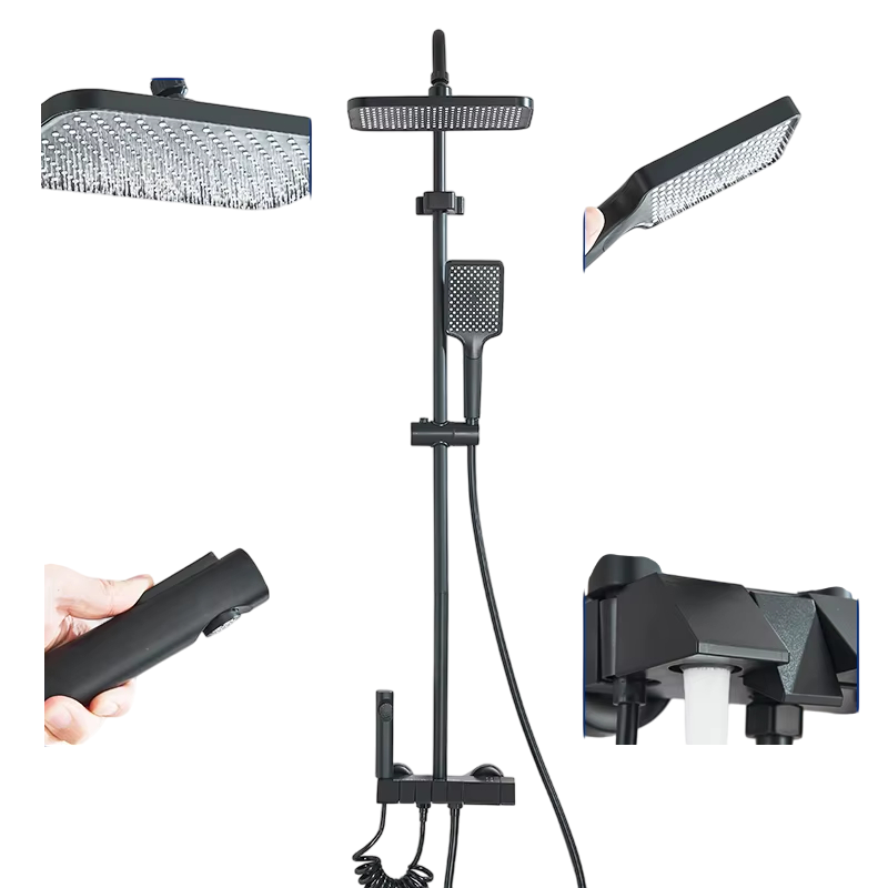 Dit complete badkamersysteem met bidetfunctie is de ideale oplossing voor moderne badkamers die comfort, praktische toepassingen en een elegant design vereisen. Het combineert een regendouche voor een ontspannende ervaring met een handdouche voor maximale flexibiliteit. Ook inbegrepen is een bidetdouche die zacht en nauwkeurig reinigen mogelijk maakt dankzij de hoge waterdruk.