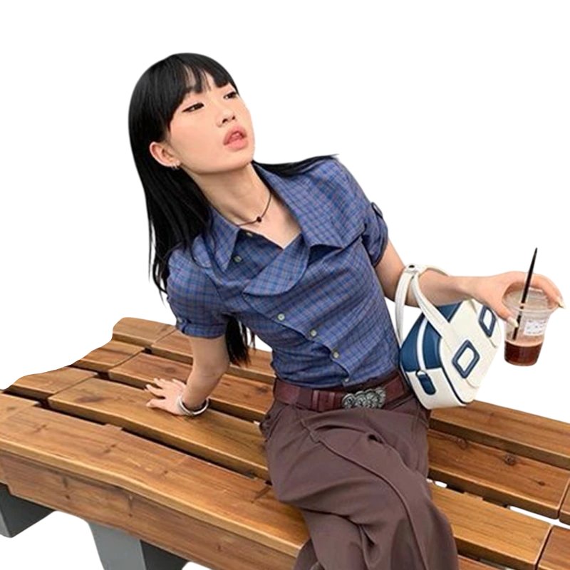 Startpagina Startpagina Kleding en accessoires Dameskleding Dames overhemden Dames casual overhemden Elegante dames blauwe blouse met korte mouwen Stijlvolle blouse met kraag en asymmetrische knoopsluiting Comfortabele top van katoen en polyester