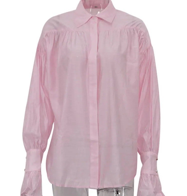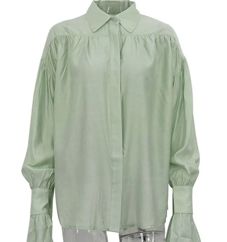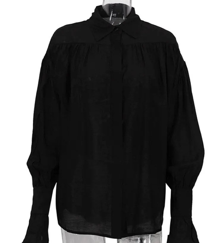 Startpagina Startpagina Kleding en accessoires Dameskleding Dames overhemden Dames casual overhemden Elegante dames doorzichtige blouse met lange mouwen Effen polyester blouse met uitlopende mouwen en kraag Stijlvolle blouse met knopen