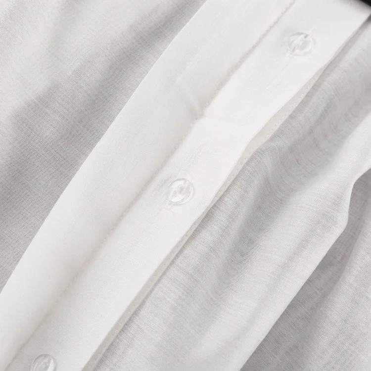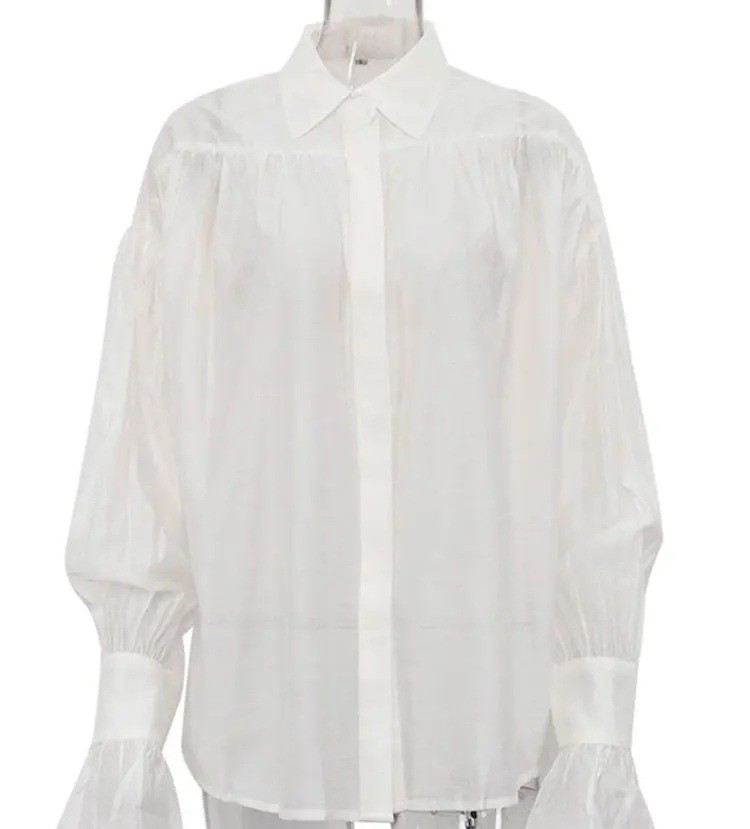 Deze dames blouse valt op door zijn lichte en luchtige ontwerp, dat zeer vrouwelijk en elegant aanvoelt. Door het doorzichtige materiaal kan het gemakkelijk worden gecombineerd met een top, tanktop of kanten ondergoed, waardoor je een verfijnde en sensuele uitstraling creëert. De uitlopende mouwen geven het model een moderne en creatieve uitstraling, terwijl de klassieke kraag een bescheiden elegantie behoudt. De polyester stof zorgt voor lange levensduur, eenvoudig onderhoud en comfort tijdens het dragen. Deze blouse is een geweldige keuze voor vrouwen die er elegant uit willen zien, zich comfortabel willen voelen en willen opvallen met hun stijl bij elke gelegenheid.