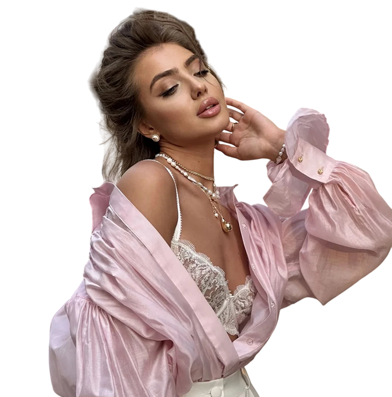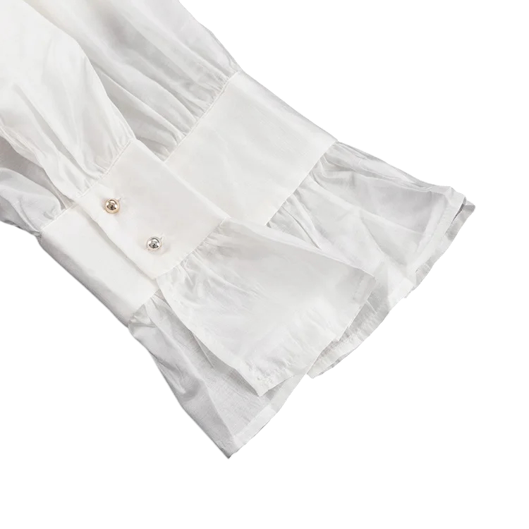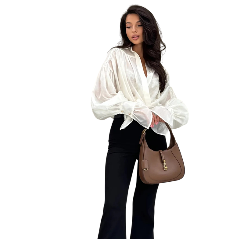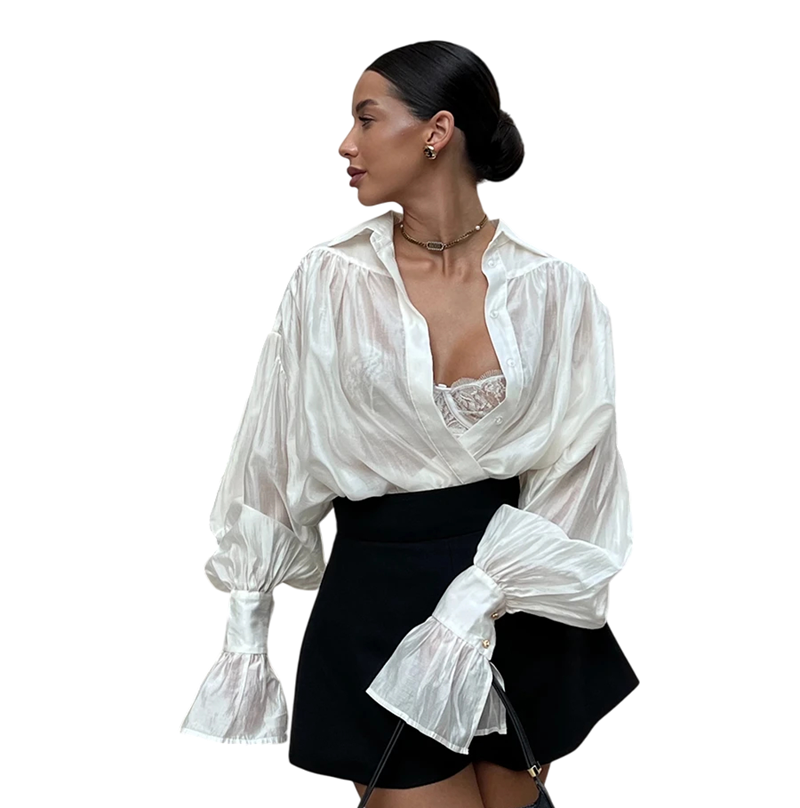 Lichte elegante dames blouse met uitgebreide mouwen en knopen. Gemaakt van een elastische mix van viscose, spandex en nylon voor comfortabel dragen. Volledige beschrijving