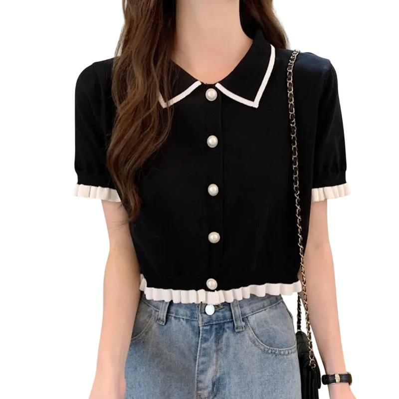 Elegante damesblouse met korte mouwen Effen blouse van polyester met streepjes op de kraag en volants op de mouwen Stijlvolle top met knopen