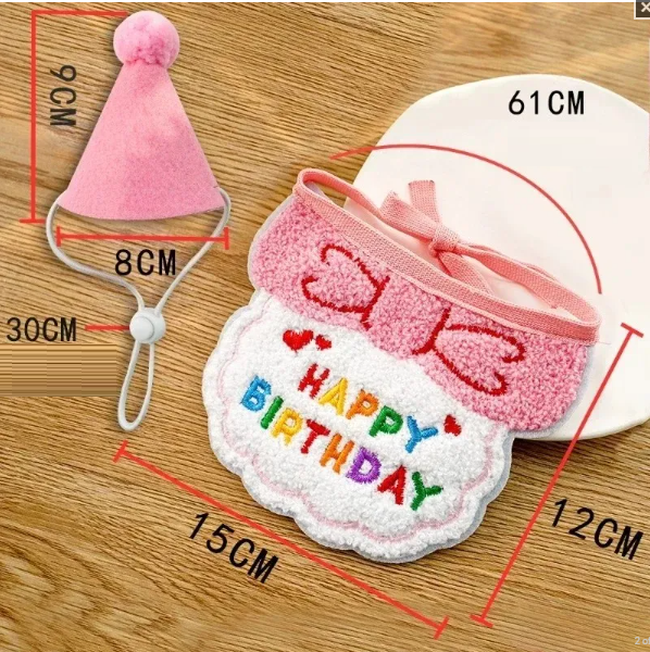 Schattige verjaardagoutfit met borduring en hoed voor honden en katten. Volledige beschrijving
