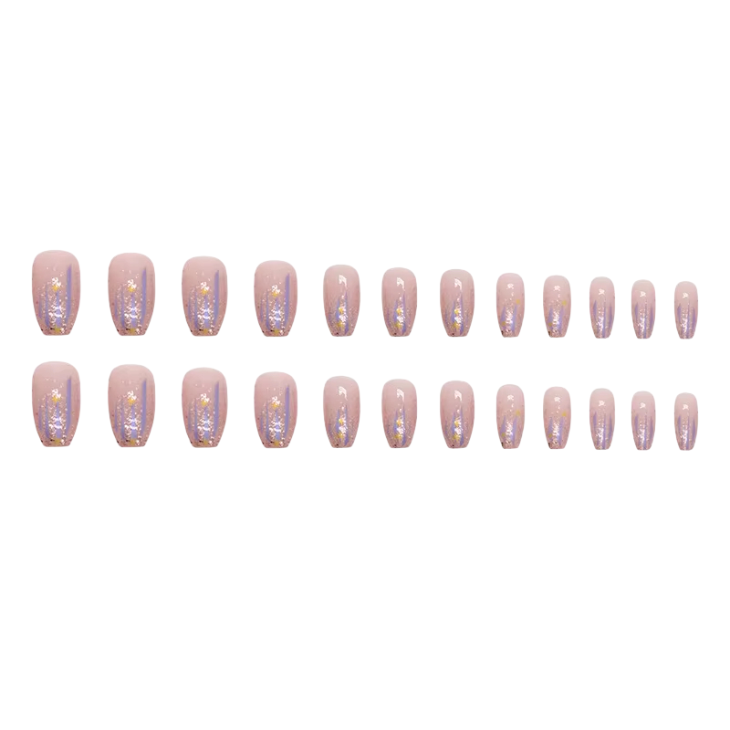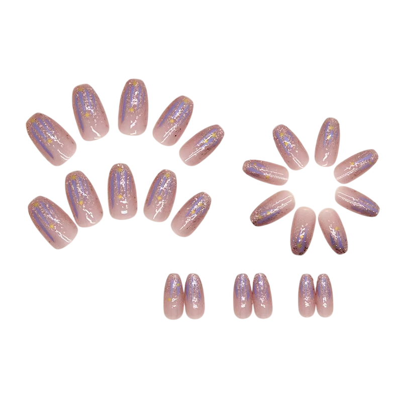 Deze collectie kunstnagels is ontworpen voor iedereen die snel een opvallende en feestelijke uitstraling wil bereiken zonder een salon te bezoeken. Het glinsterende oppervlak geeft de manicure een luxe effect dat perfect is voor feesten, vieringen en speciale evenementen. Coffin silhouet behoort tot de populairste moderne vormen en in combinatie met de middellange lengte ziet het er elegant uit, maar blijft tegelijkertijd comfortabel voor dagelijks gebruik. Het acrylmateriaal zorgt voor een realistisch uiterlijk en een prettig gevoel op de nagels. Dankzij de brede selectie van maten is het eenvoudig om de ideale variant voor elke vinger te kiezen.