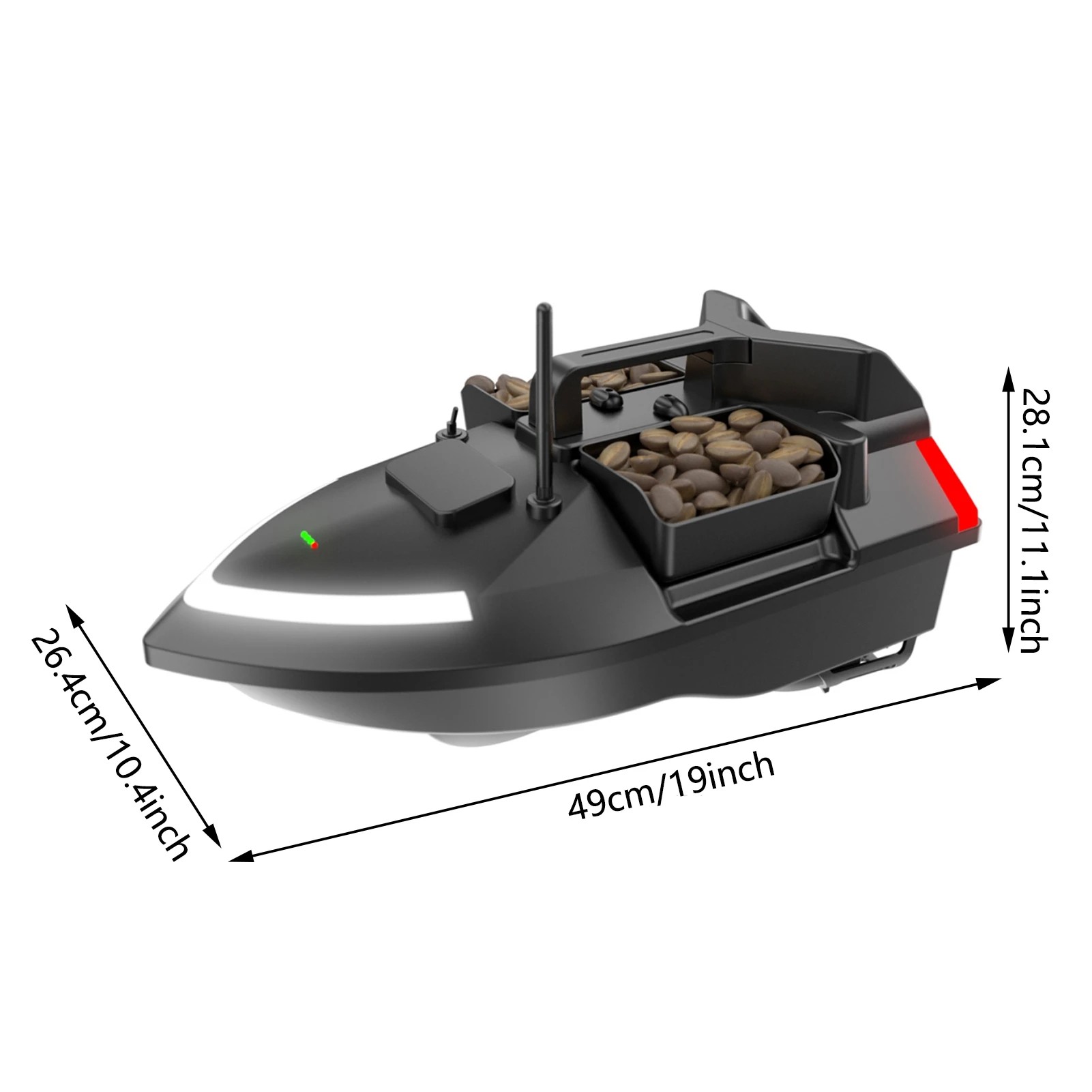 GPS voerboot 49 x 26,4 x 28,1 cm Batterij 5200 mAh Draagvermogen 2 kg Bereik 500 m 40 punten Automatische terugkeer