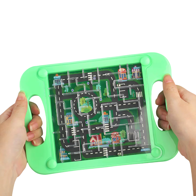 Het gravitatiedoolhof met het thema van een wegstad biedt kinderen en volwassenen een leuke en tegelijkertijd leerzame activiteit die de natuurlijke ontwikkeling van motoriek en denken bevordert. De speler kantelt het hele bord met de hand zodat de stalen kogel door het ingewikkelde netwerk van wegen, kruispunten en bochten naar de finish kan komen. Deze activiteit ontwikkelt hand-oogcoördinatie, verbetert de concentratie en leert strategisch denken. Het realistische stadsontwerp met verkeersonderdelen helpt kinderen bij het basisbegrip van verkeersoriëntatie en bevordert visuele waarneming. Het doolhof is geschikt als slimme speelgoed voor de vroege ontwikkeling van het kind en vormt tegelijkertijd een leuk puzzel voor oudere kinderen of volwassenen. Het spel met afmetingen 20 x 14,5 cm is ideaal voor kinderkamers, onderweg of in schoolgroepen.