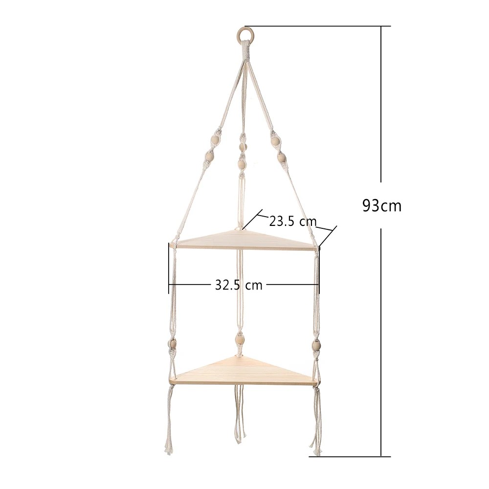 De hangende hoekplank in een twee-laags uitvoering maakt efficiënte benutting van de ruimte in de hoek van de kamer mogelijk. De breedte van de voorrand is 32,5 cm, de zijafmeting is ongeveer 23,5 cm en de totale hoogte van de ophang is ongeveer 93 cm. De plank is opgehangen aan stevig touw met decoratieve kralen. Twee opslagvlakken bieden meer ruimte voor decoraties en kleine voorwerpen. Geschikt voor lichtere accessoires en woondecoraties.