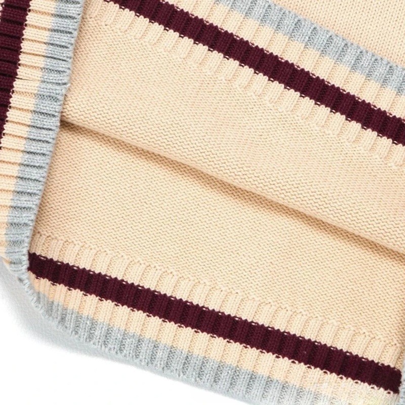 Dit vest is populair vanwege zijn eenvoud, veelzijdigheid en het vermogen om een outfit een unieke uitstraling te geven. Elegante bies met kleurrijke strepen trekt de aandacht en onderscheidt het van klassieke effen vesten. Dankzij de praktische mouwloze snit biedt het vrijheid van beweging en maakt het comfortabele layering mogelijk, zonder zwaar over te komen.