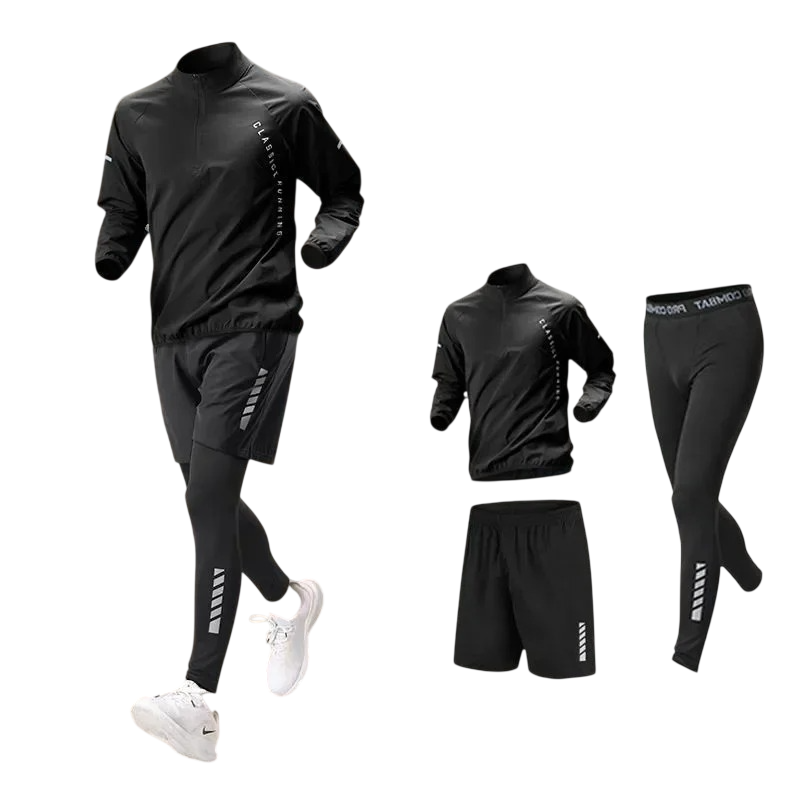 Heren sportoutfit met leggings, shorts en hoodie, gemaakt van polyester en spandex. Ideaal voor comfortabel dragen tijdens sport en vrije tijd. Volledige beschrijving