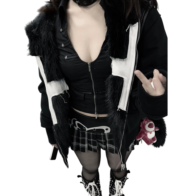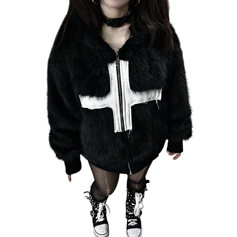 De jas is gemaakt van polyester, dat duurzaam is, gemakkelijk te onderhouden en langdurig zijn uiterlijk behoudt. Kunstbont is aangenaam aanvoelend en heeft een verwarmend effect, waardoor de jas ideaal is voor de winterperiode. Op de borst bevindt zich een kruis, dat het moderne en onconventionele ontwerp benadrukt. De praktische snit van de jas biedt comfort bij dagelijks gebruik en laat tegelijkertijd voldoende ruimte voor het lagen van kleding. Het algehele uiterlijk van de jas is opvallend en geschikt voor iedereen die warmte, comfort en een unieke stijl wil combineren.