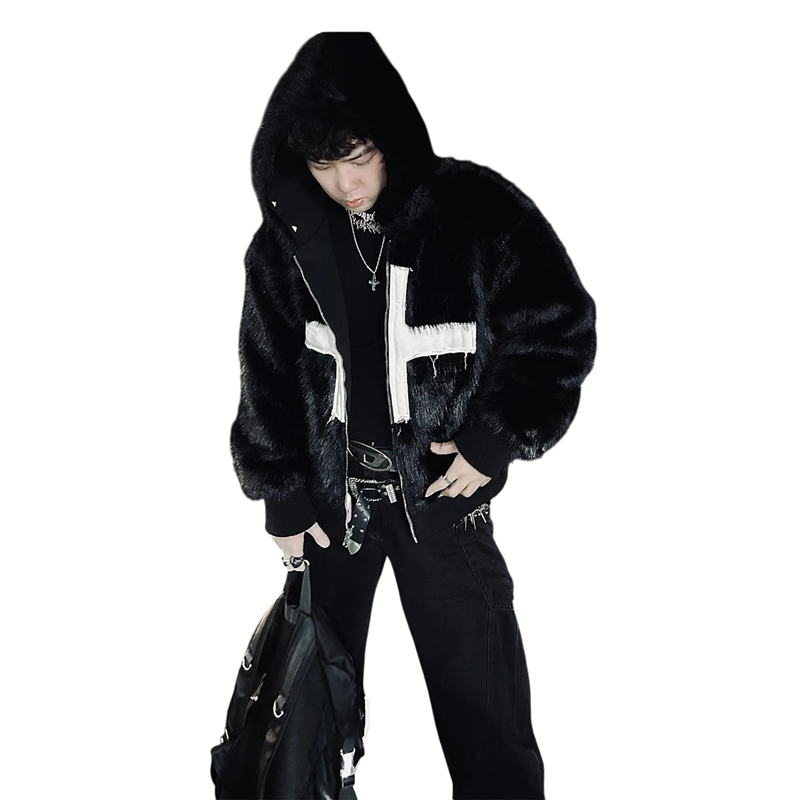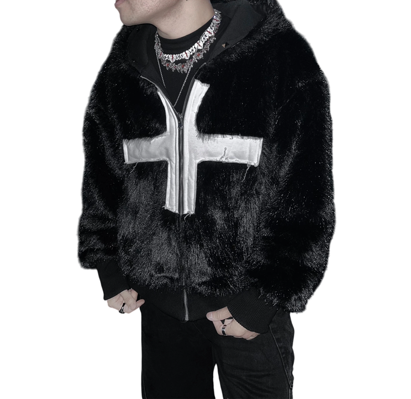 Stijlvolle heren winterjas van kunstbont met capuchon, winddichte uitvoering en ritssluiting. Zwarte kleur en kruis op de borst voor een opvallende uitstraling. Volledige beschrijving