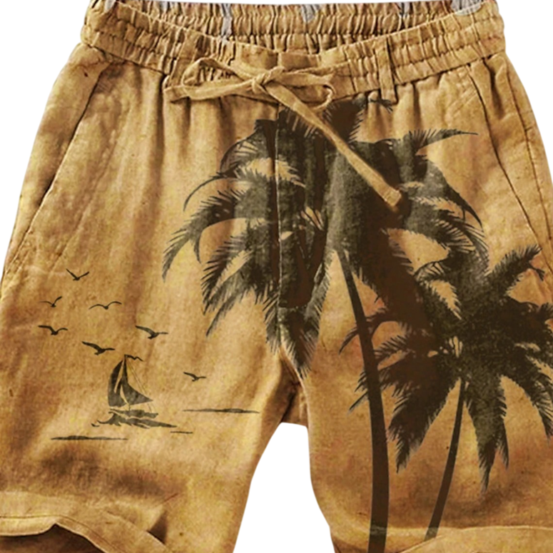 Lichte zwemshorts met palmprints, koord en zakken. Comfortabel polyester, ideaal voor het strand, zwembad en vakantie. Volledige beschrijving