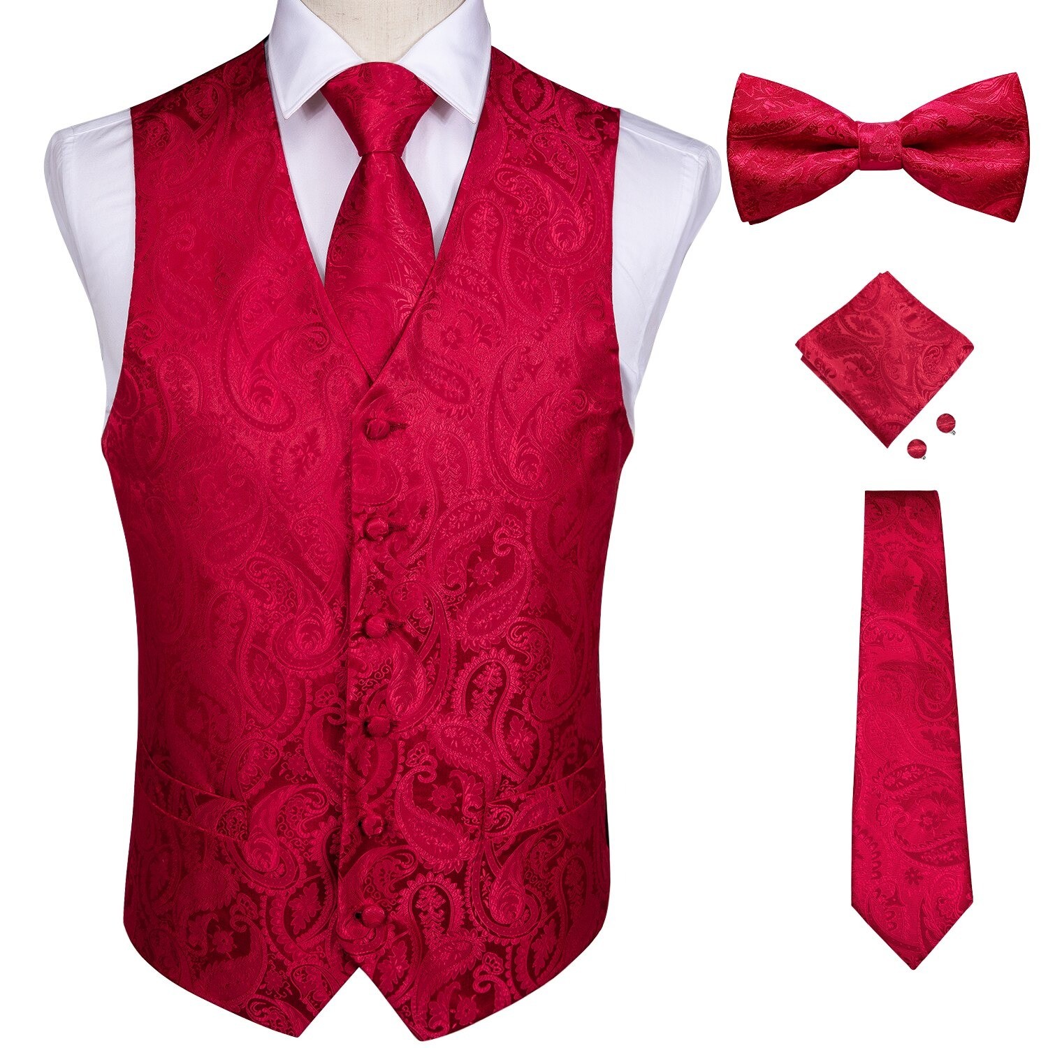 Inhoud van het pakket: 1x vest, 1x vlinderdas, 1x stropdas, 1x pochet, 2x manchetknopen