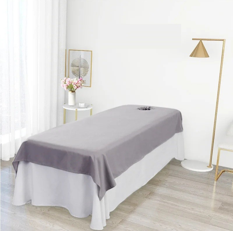 Zacht hoeslaken voor cosmetische of massagebedden met een opening voor het gezicht biedt comfort aan cliënten en beschermt het bed tijdens behandelingen. Volledige beschrijving