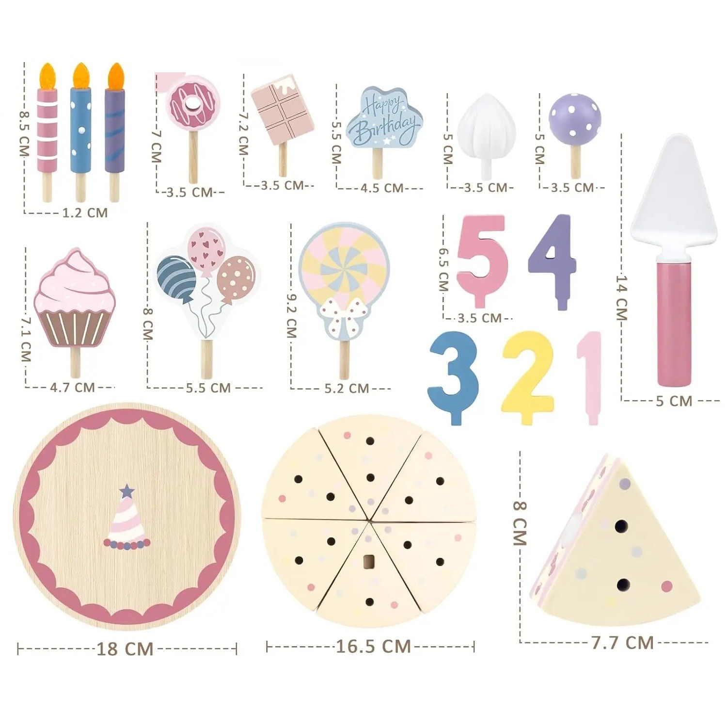 Houten verjaardagstaart 16,5 cm Kinder snijspel met kaarsjes, versieringen en lepel Keuken speelgoed voor feestelijk spelen