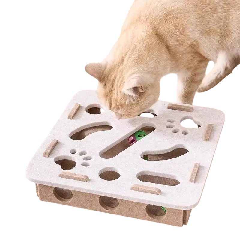 Het principe van het spel is dat de kat het balletje volgt, verschuift en actief speelt binnen de puzzelstructuur. Deze manier van spelen ontwikkelt op natuurlijke wijze concentratie, coördinatie van de pootjes en het vermogen om eenvoudige taken op te lossen. De viltconstructie dempt het geluid tijdens het spelen, wat vooral gewaardeerd wordt door eigenaren in een appartement. De puzzel speelgoed biedt de kat plezier, zelfs wanneer deze alleen thuis is, en helpt verveling en ongewenst gedrag te voorkomen.