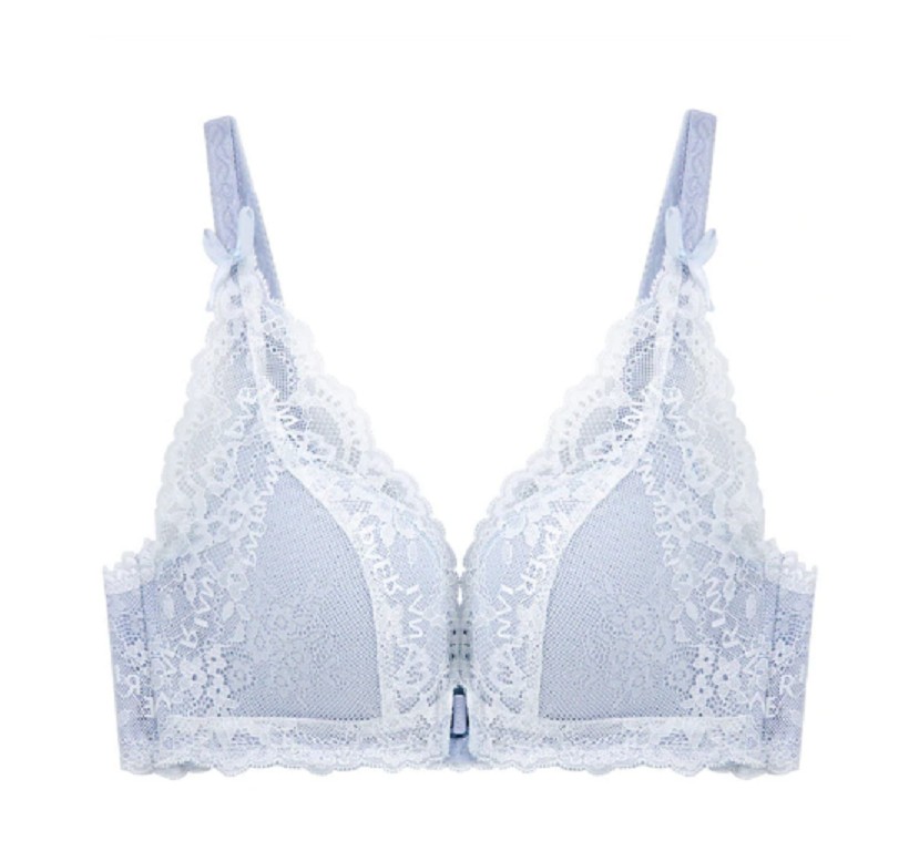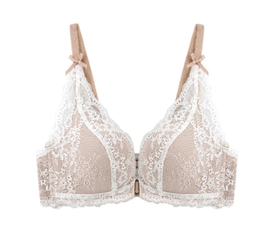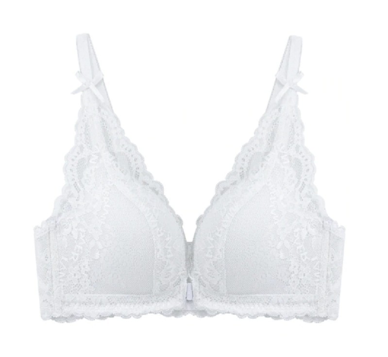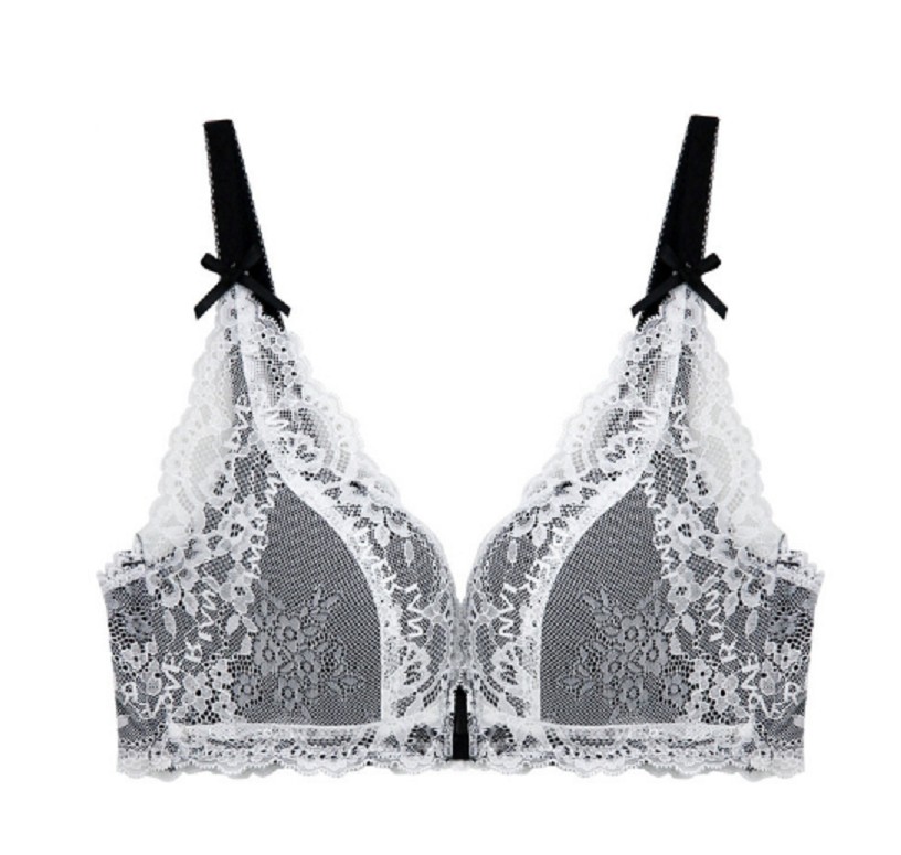 Deze kanten bh heeft een sluiting aan de voorkant.