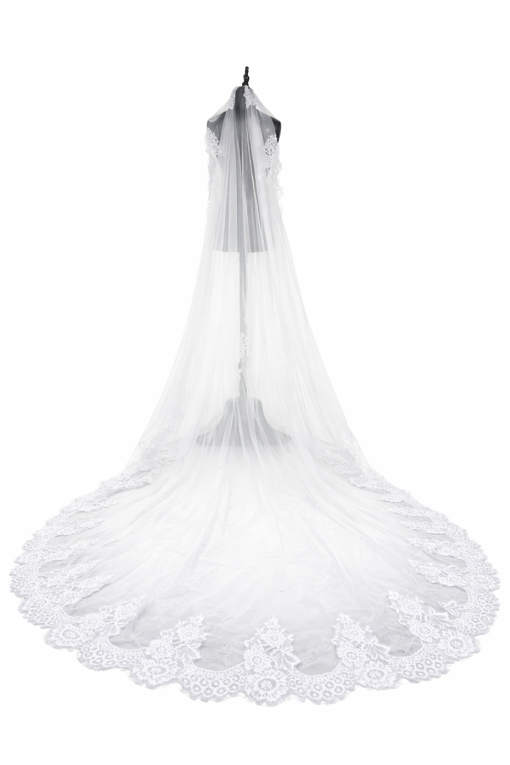 Deze witte trouwsluier van 500 cm is ontworpen voor bruiden die een werkelijk onvergetelijke indruk willen maken. De katedrale lengte geeft een majestueus effect aan de feestelijke entree en valt prachtig achter de figuur en de sleep van de jurk. Het fijne eenlaagse tule voelt licht en luchtig aan, waardoor de sluier niet zwaar aanvoelt, maar natuurlijk beweegt tijdens het lopen. De rijke kantafwerking rondom geeft een romantische en luxe uitstraling, die prachtig tot zijn recht komt tijdens de ceremonie en op foto's. De praktische metalen kam maakt het eenvoudig en stevig bevestigen in het haar mogelijk.