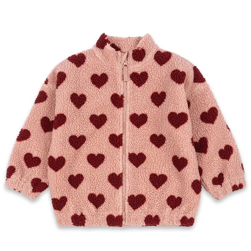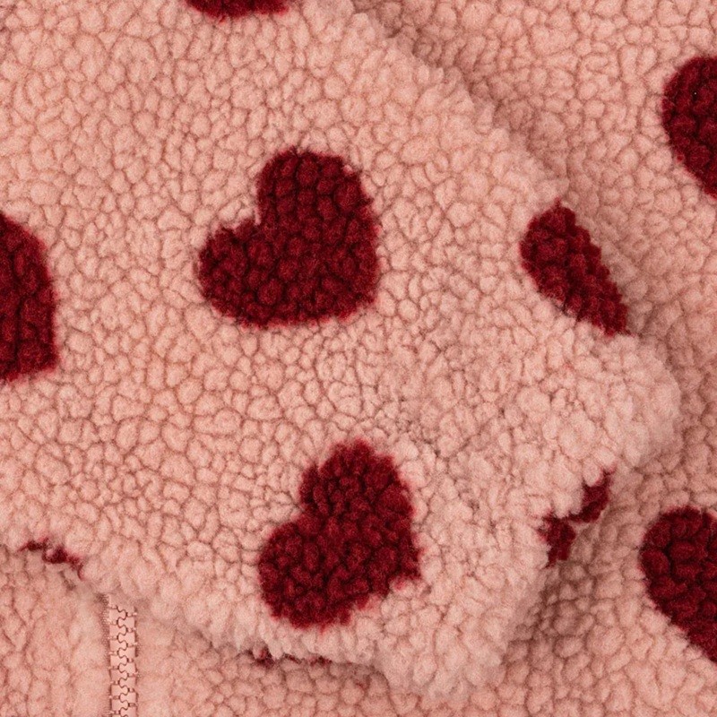 Schattige pluche winterjas in roze met hartjesmotief, rits en hoge kraag. Katoen en polyester zorgen voor zachtheid, warmte en comfortabel dragen. Volledige beschrijving