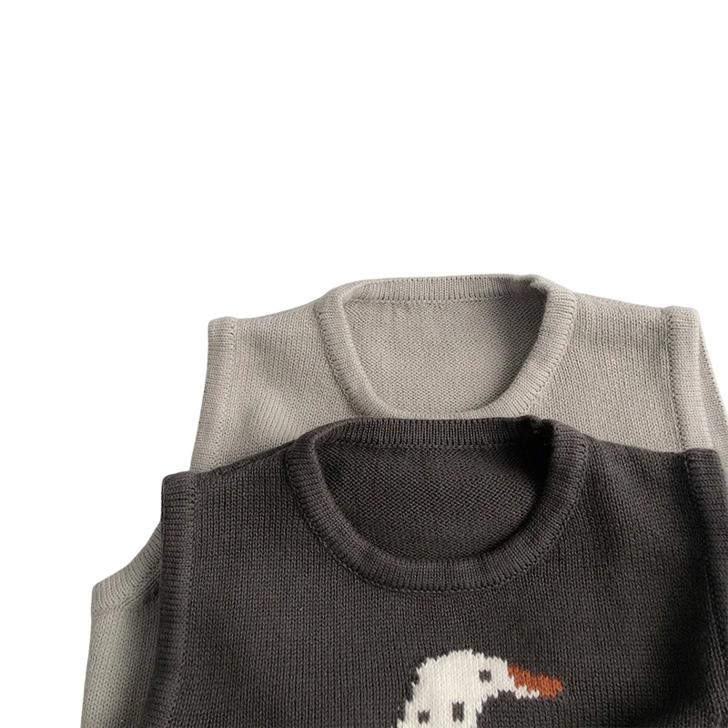 Schattig kinder katoenen vest in donkergrijze kleur met afbeelding van een gans. Comfortabele gebreide trui voor jongens en meisjes, geschikt voor de lente en de herfst. Volledige beschrijving