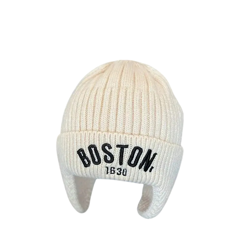 Kinderen gebreide winter oorwarmers Boston 1–3 jaar Polyester warme muts met oorkleppen en borduring Zachte wintermuts voor kinderen