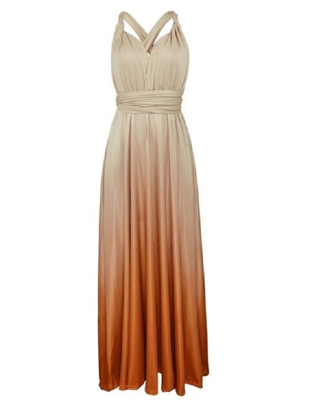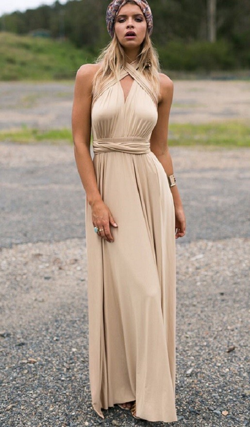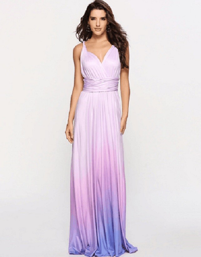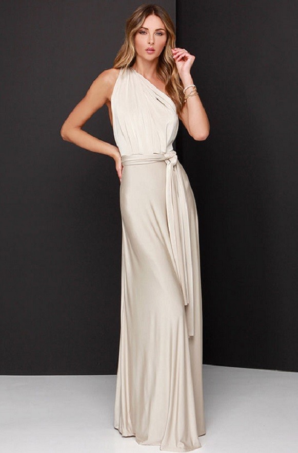 Prachtige lange avondjurk van glad glanzend materiaal.