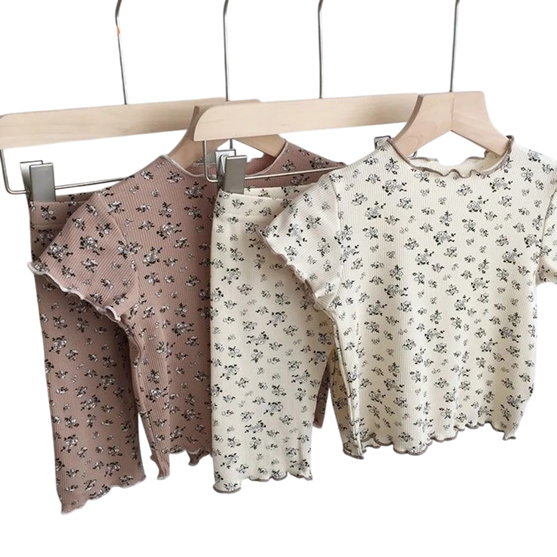 Het bovenstuk bestaat uit een T-shirt met korte mouwen en O-hals, wat zorgt voor gemakkelijke aan- en uittrekken en comfortabel dragen gedurende de dag. De zachte bloemenprint geeft de kleding een meisjesachtige en vrolijke uitstraling. De broek heeft een comfortabele snit en elastische taille, waardoor deze zich gemakkelijk aanpast aan het lichaam van het kind en niet knelt. De gebruikte combinatie van katoen en polyester biedt een evenwichtige verhouding van zachtheid, ademend vermogen en duurzaamheid voor dagelijks gebruik.